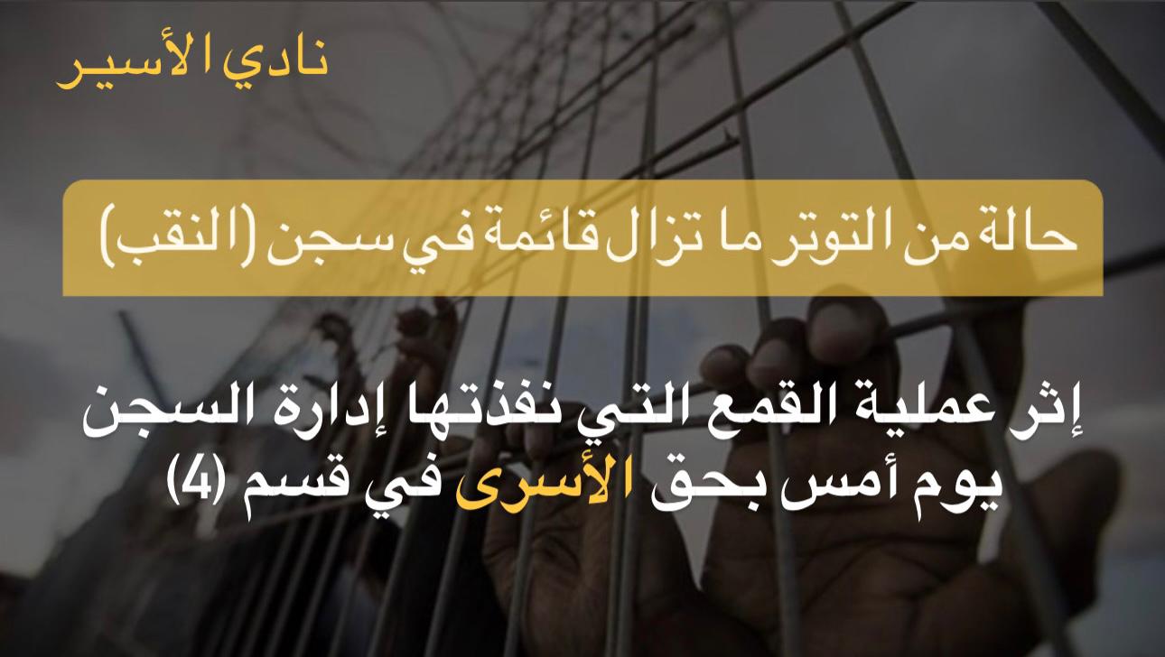 نادي الأسير: حالة من التوتر ما تزال قائمة في سجن (النقب) إثر عملية القمع التي نفّذتها إدارة السّجن يوم أمس بحق الأسرى في قسم (4)