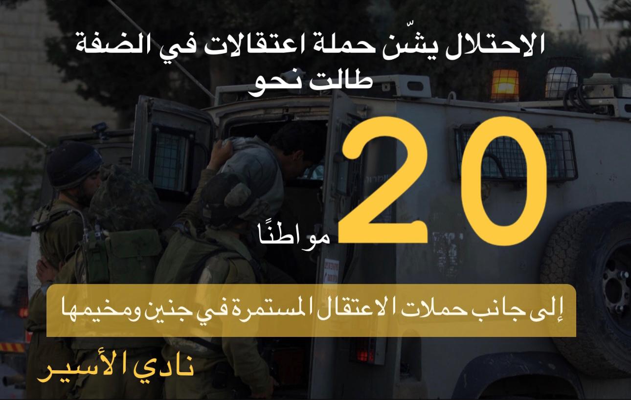 نادي الأسير: الاحتلال يشنّ حملة اعتقالات في الضّفة طالت نحو (20) مواطنًا وذلك إلى جانب حملات الاعتقال المستمرة في جنين ومخيمها