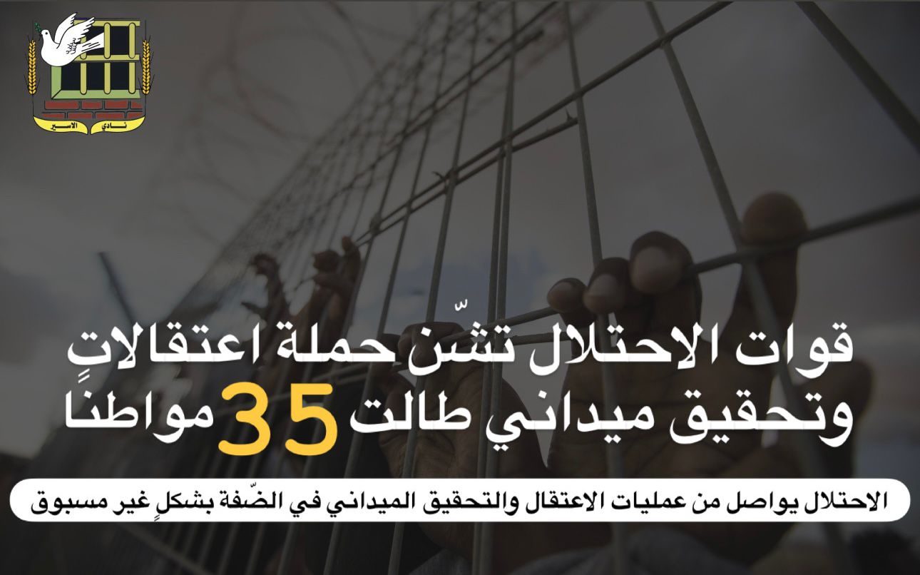 🔴 نادي الأسير: قوات الاحتلال تشّن حملة اعتقالات وتحقيق ميداني طالت (35) مواطنًا على الأقل