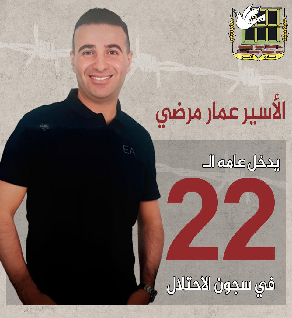 نادي الأسير: يدخل الأسير عمار مصطفى مرضي (42 عاماً) من رام الله، عامه الـ22 في سجون الاحتلال الإسرائيلي.