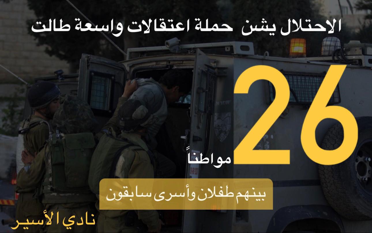الاحتلال يشّن حملة اعتقالات واسعة طالت 26 مواطنًا من الضفة
