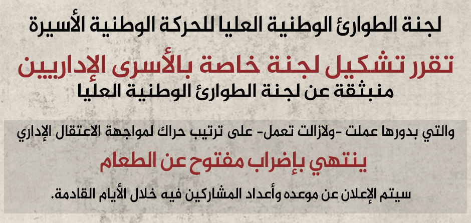 بيان صادر عن لجنة الطوارئ الوطنية العليا للحركة الوطنية الأسيرة للإعلان عن تشكيل لجنة الأسرى الإداريين