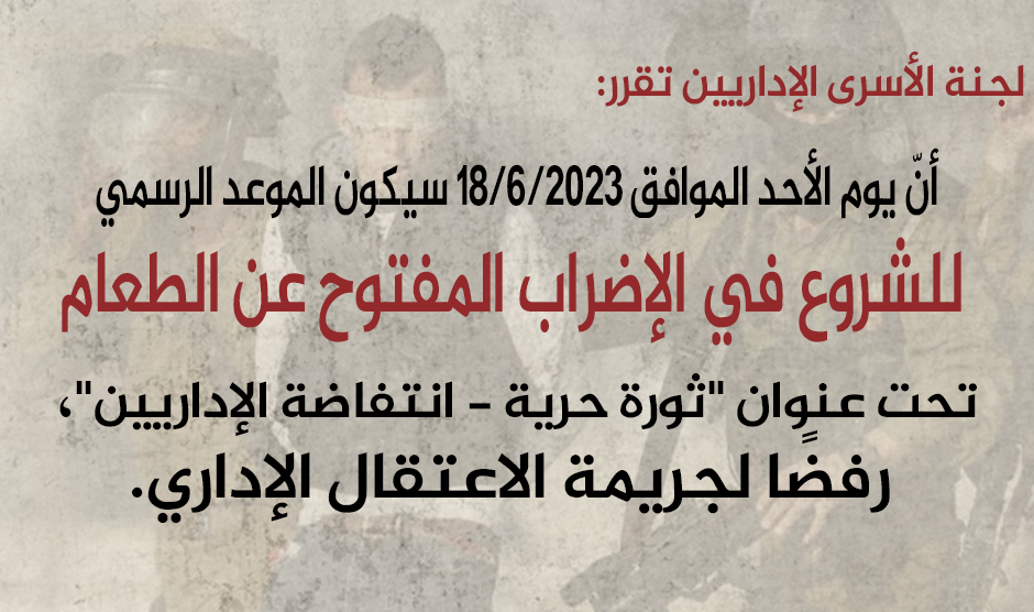 المعتقلون الإداريون يقررون 18 حزيران موعدًا للبدء بمعركةبالإضراب المفتوح عن الطعام تحت عنوان "ثورة حرية - انتفاضة الإداريين"
