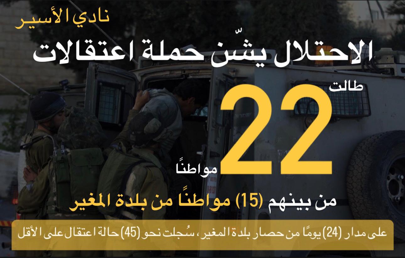 الاحتلال يشّن حملة اعتقالات طالت 22 مواطنًا من بينهم (15) مواطنًا من بلدة المغير