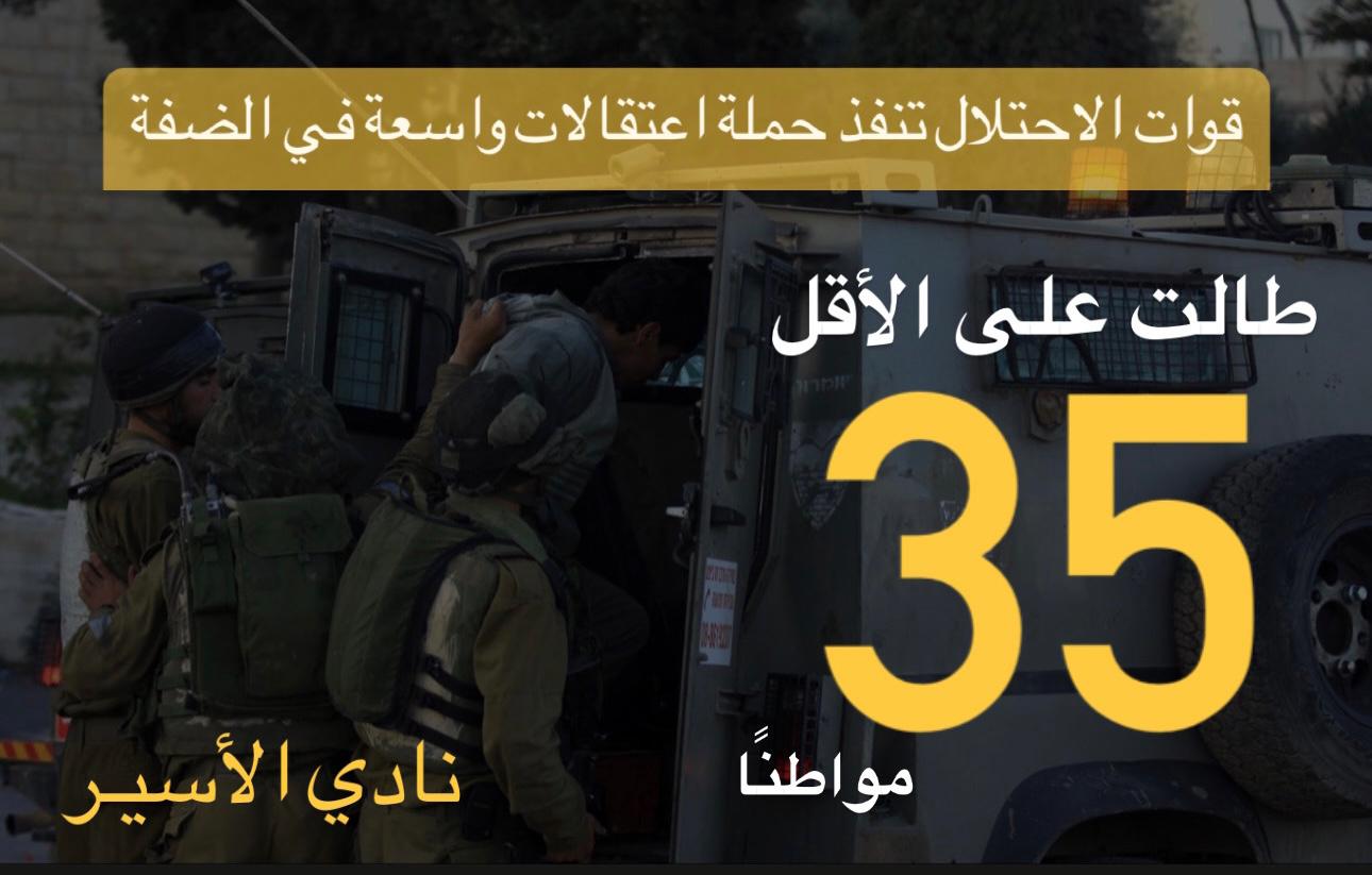 قوات الاحتلال تنفذ حملة اعتقالات واسعة في الضفة طالت على الأقل (35) مواطنًا تركزت في بلدة تقوع