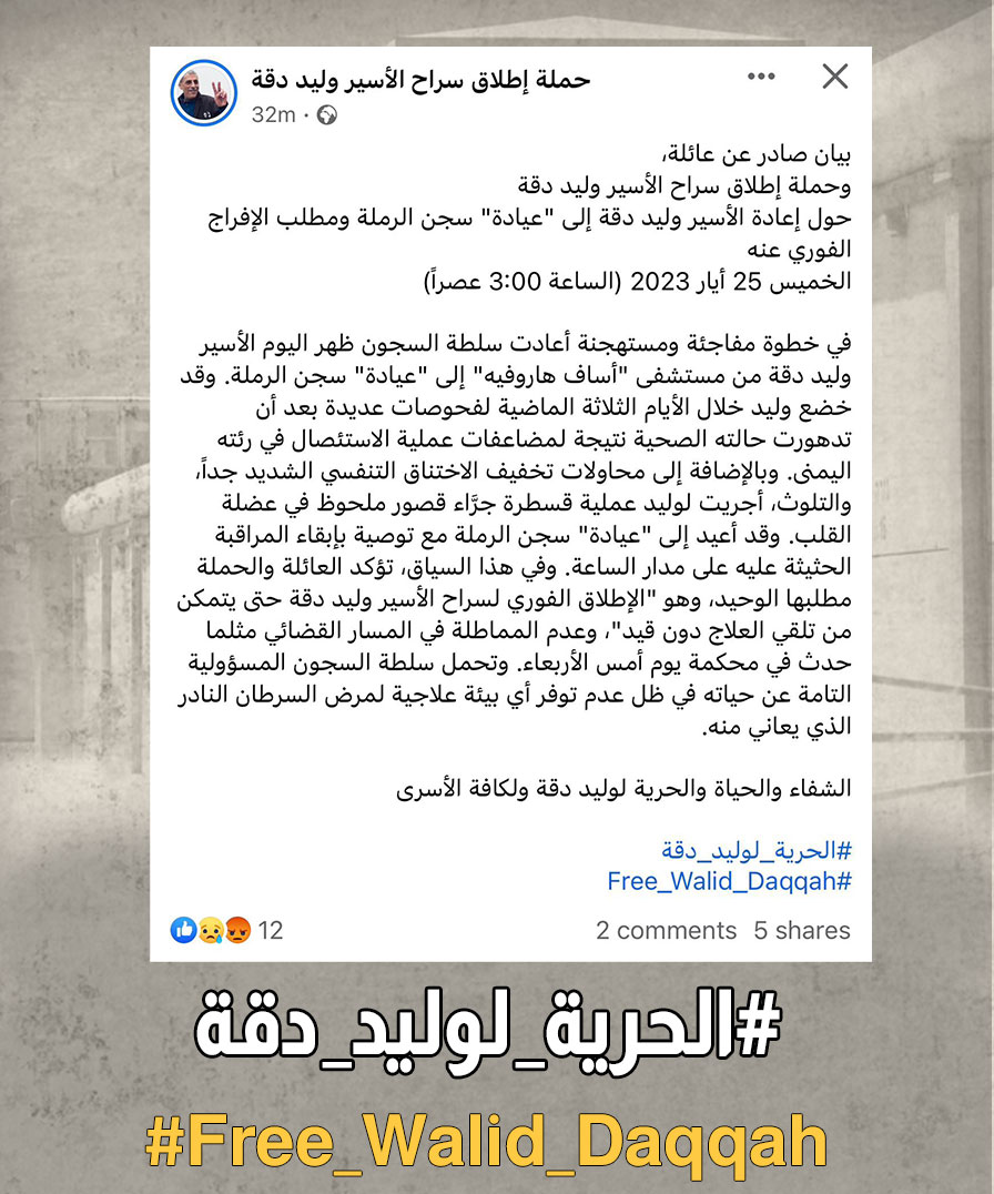 حول إعادة الأسير وليد دقة إلى "عيادة" سجن الرملة ومطلب الإفراج الفوري عنه