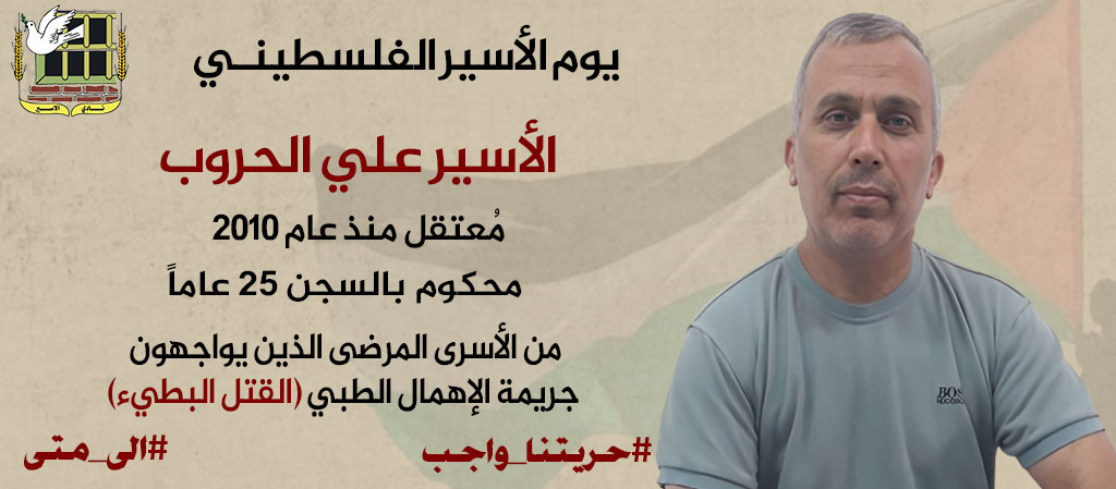 الأسير علي الحروب (48 عامًا) من مدينة دورا / الخليل، معتقل منذ عام 2010، والمحكوم بالسّجن 25 عامًا، بدأ بمواجهة مرض السرطان قبل أكثر من عامين