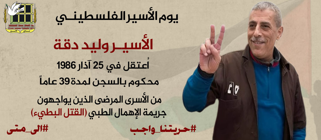 مع اقتراب يوم الأسير الفلسطينيّ، وفي الذكرى الـ21 على اعتقال القائد مروان البرغوثي وفي ظل الوضع الصحي الخطير جدًا الذي يواجهه القائد دقّة