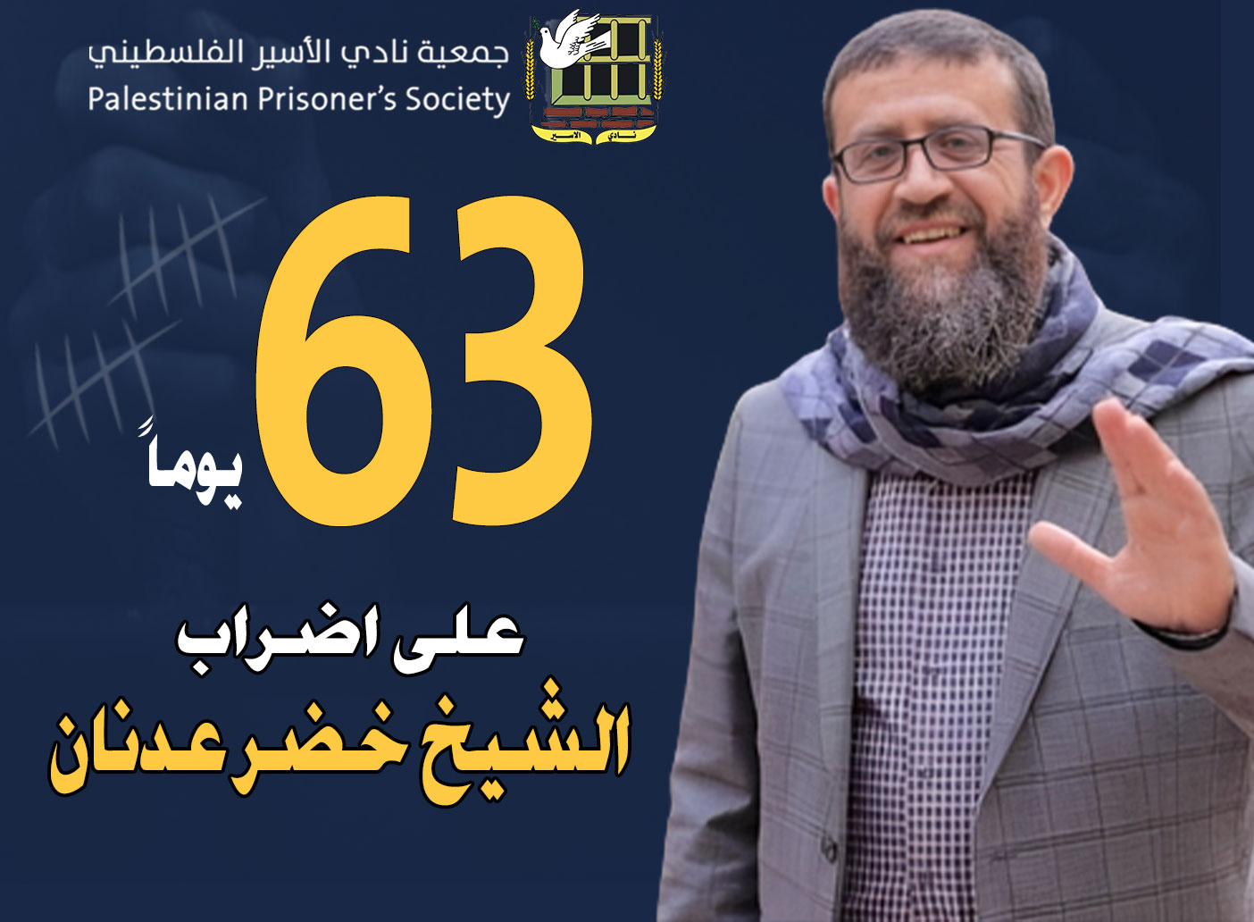 نادي الأسير: 63 يومًا على إضراب الأسير الشيخ خضر عدنان عن الطعام، مطالبًا بحريته، وسط تدهور خطير ومستمر على وضعه الصحيّ