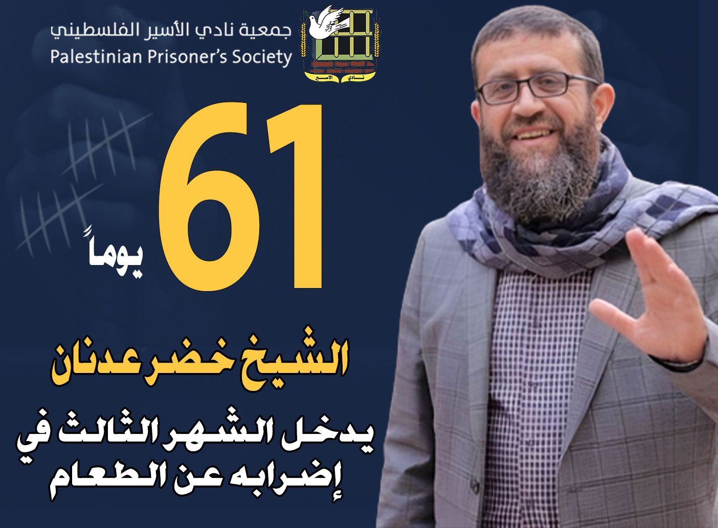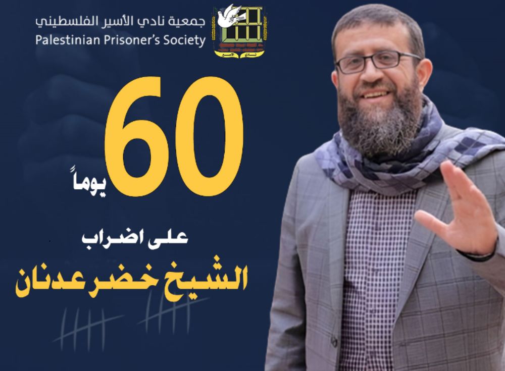 نادي الأسير: الأسير الشيخ خضر عدنان يدخل الشهر الثالث في إضرابه عن الطعام، وسط تدهور خطير ومستمر على وضعه الصحيّ، مطالبًا بحرّيّته