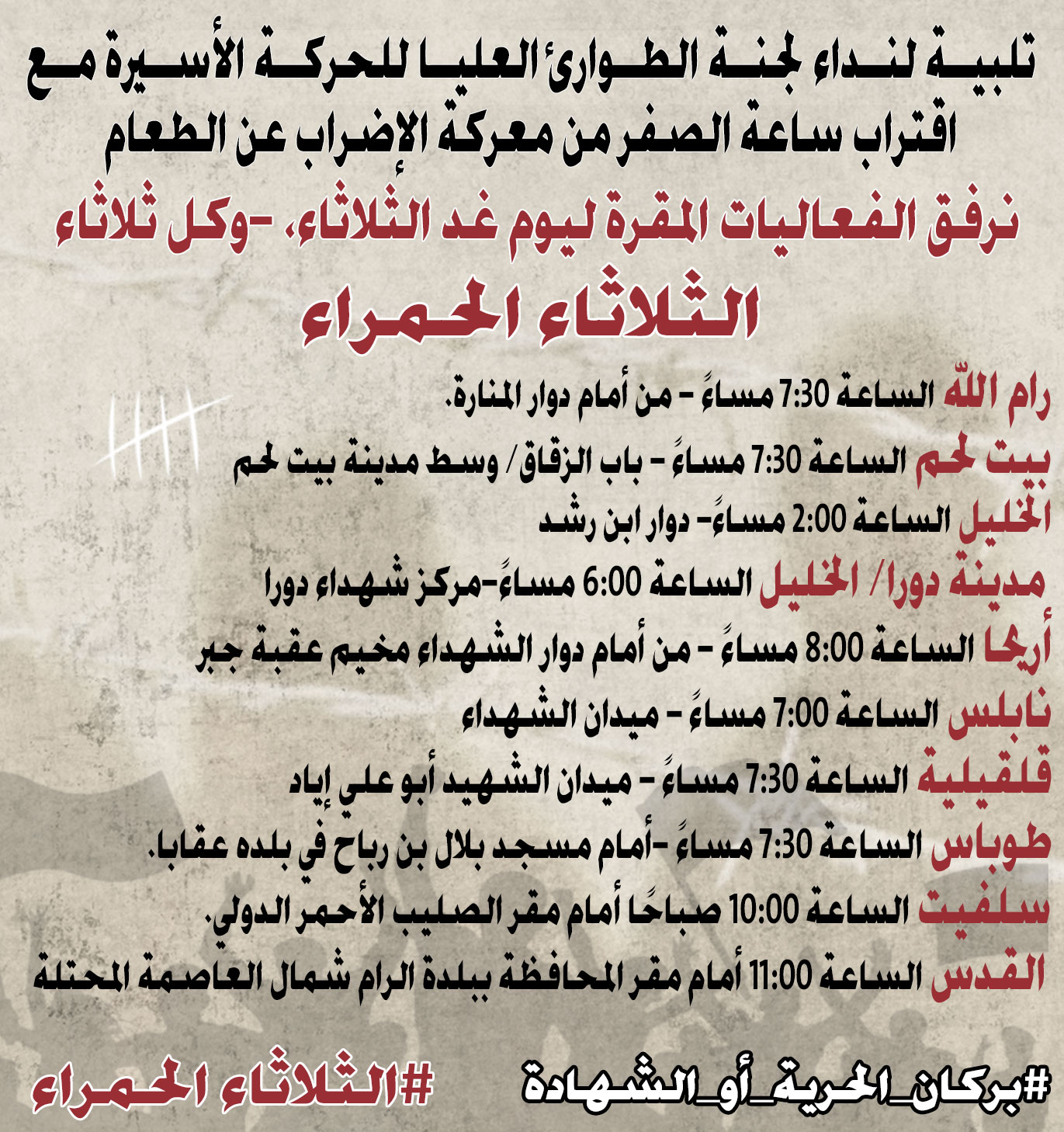 تلبية لنداء لجنة الطوارئ العليا للحركة الأسيرة مع اقتراب ساعة الصفر من معركة الإضراب عن الطعام، نرفق الفعاليات المقرة ليوم غد الثلاثاء، -وكل ثلاثاء- (الثلاثاء الحمراء)