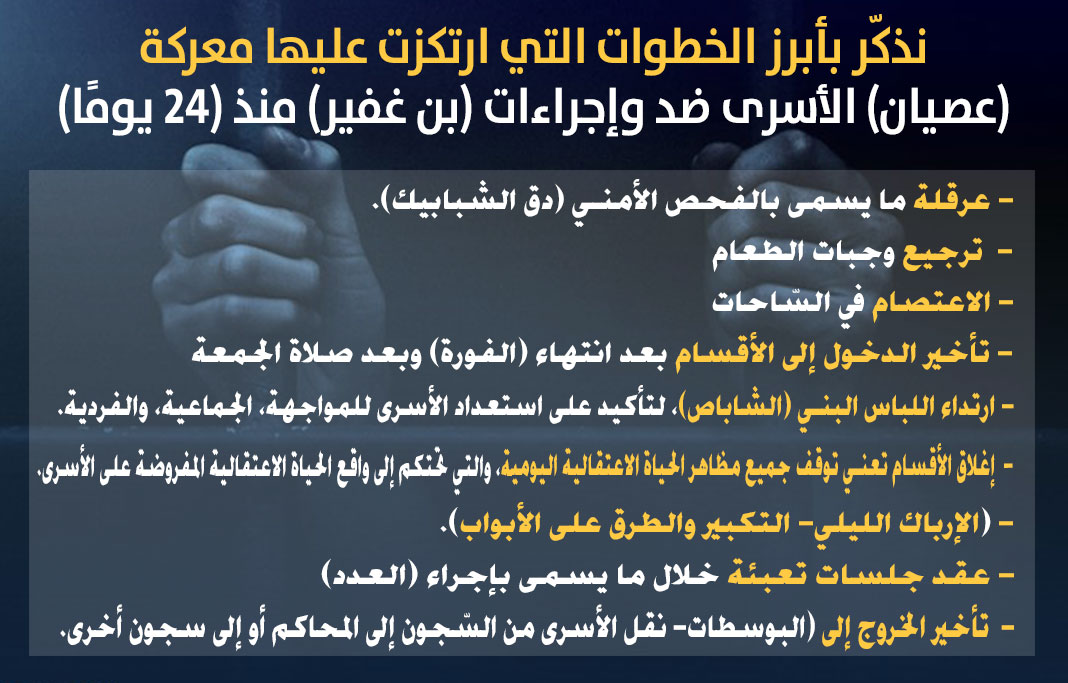 نذكّر بأبرز الخطوات التي ارتكزت عليها معركة (عصيان) الأسرى ضد وإجراءات (بن غفير) منذ (24 يومًا)