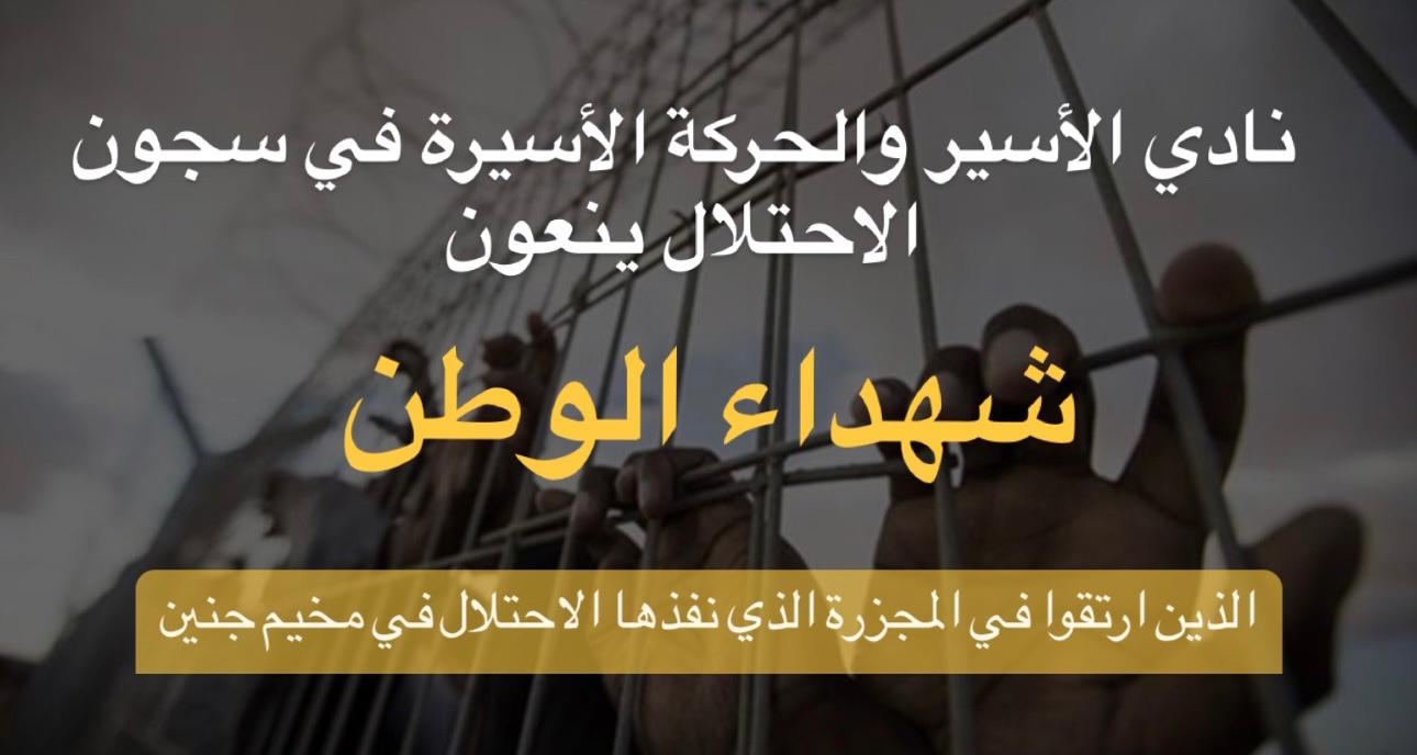 لجنة الطوارئ الوطنية العليا للحركة الوطنية الأسيرة، تنعى شهداء الوطن، الذين ارتقوا في المجزرة الذي نفذها الاحتـلال في مخيم جنين اليوم