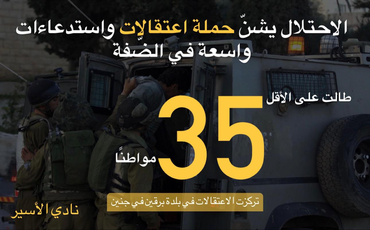 نادي الأسير: الاحتلال يشنّ حملة اعتقالات واستدعاءات واسعة في الضّفة طالت على الأقل (35) مواطنًا