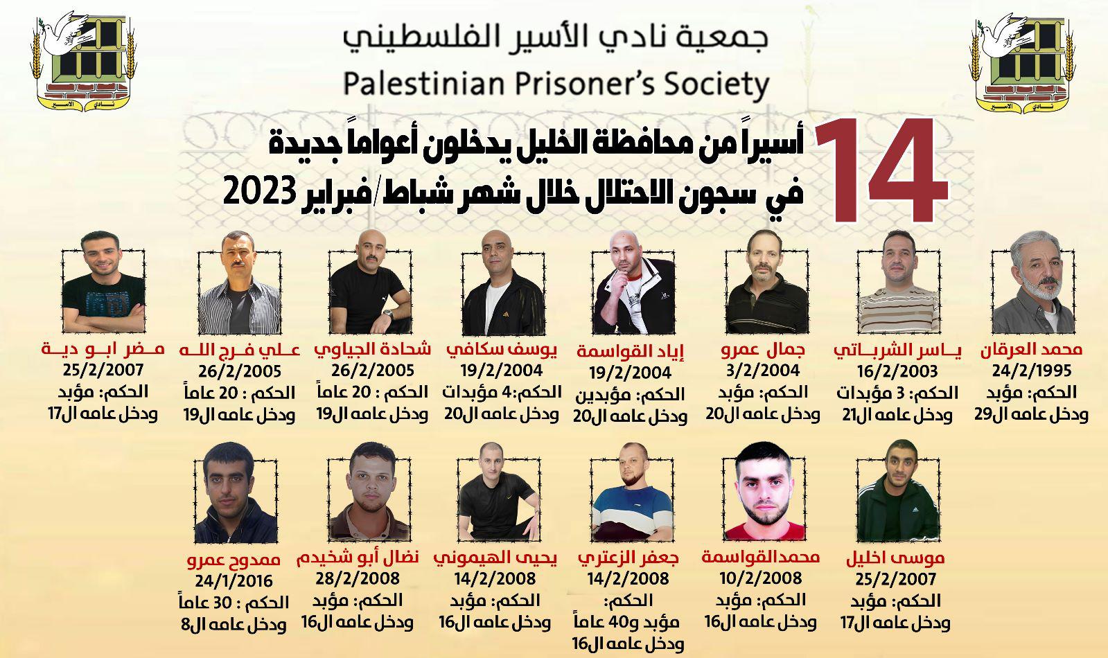 14 أسيراً من الخليل يدخلون أعواماً جديدة في سجون الاحتلال خلال الشهر الجاري