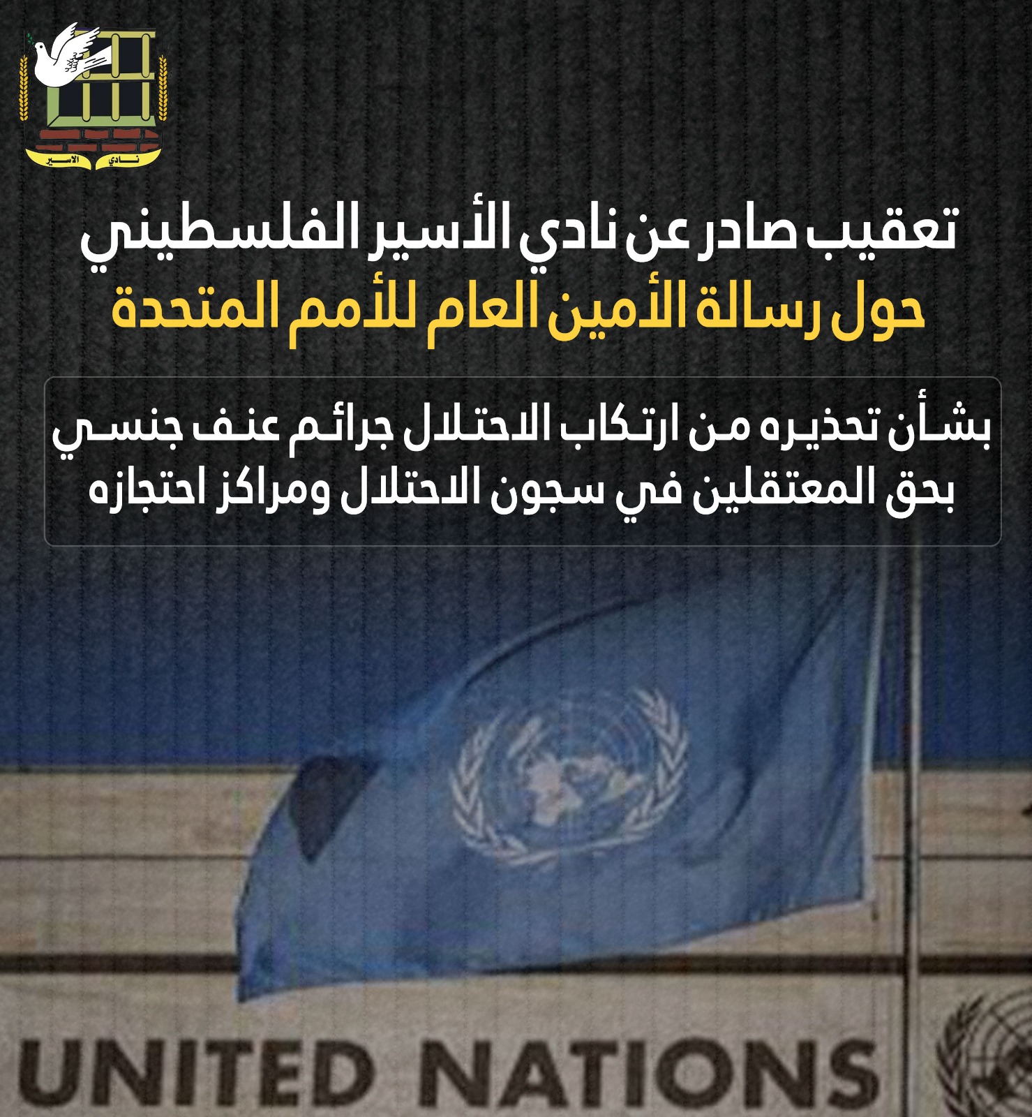 📌 تعقيب صادر عن نادي الأسير حول رسالة الأمين العام "لدولة" الاحتلال التي تضمنت تحذيرا حول ممارستها جرائم "عنف جنسي" بحق المعتقلين في سجونها ومراكز احتجاز المزيد من التفاصيل