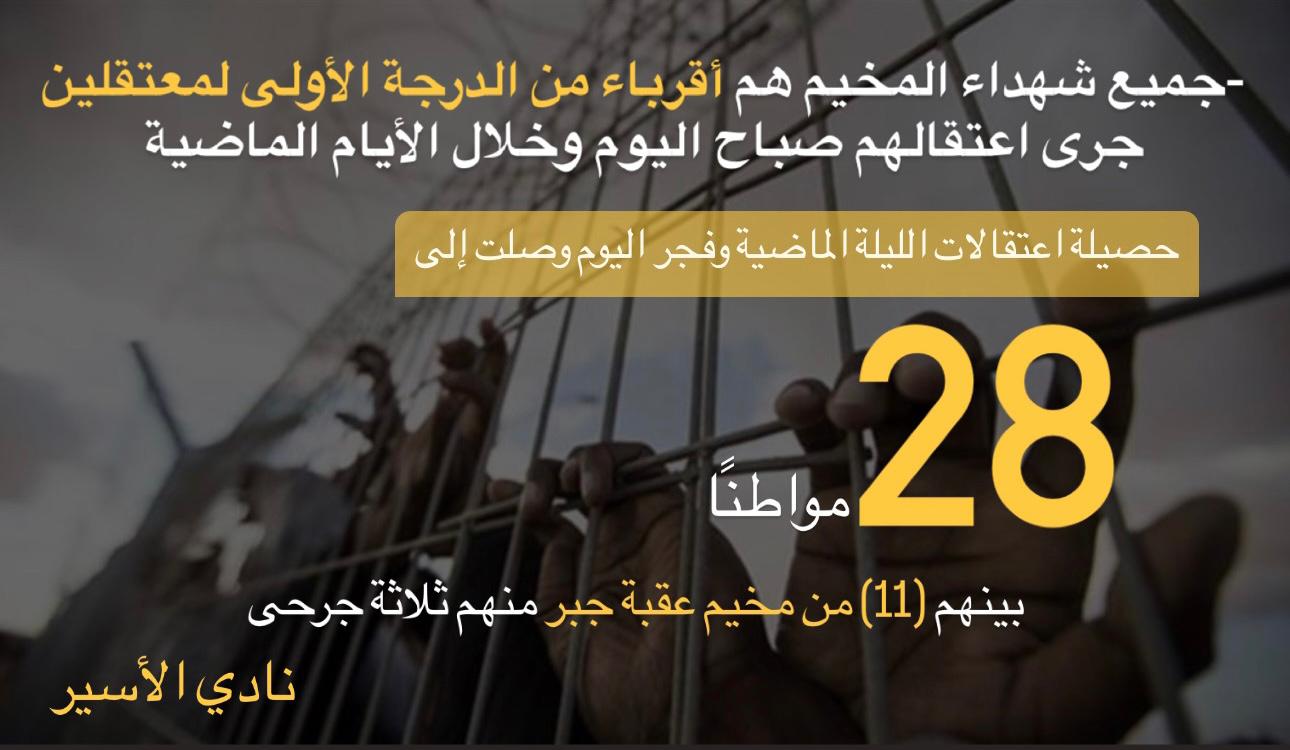 نادي الأسير: حصيلة اعتقالات الليلة الماضية وفجر اليوم وصلت إلى (28) مواطنًا بينهم (11) من مخيم عقبة جبر منهم ثلاثة جرحى