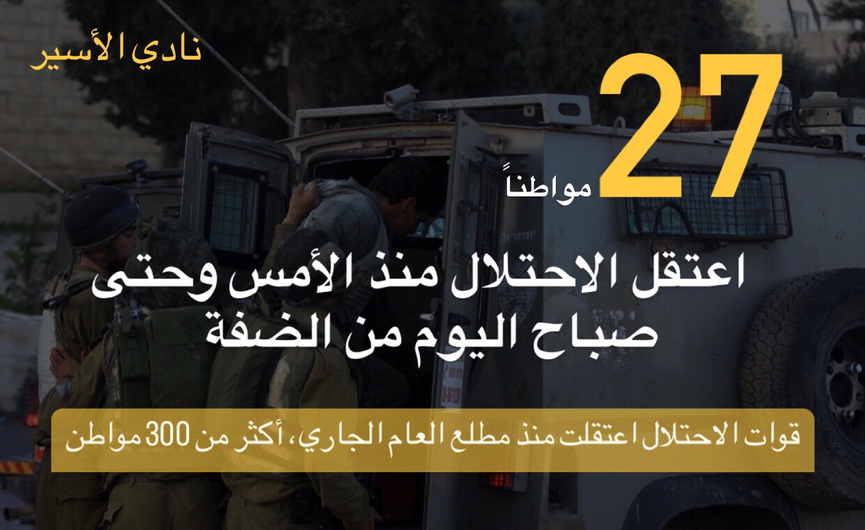 نادي الأسير: الاحتلال اعتقل منذ الأمس وحتى صباح اليوم، (27) مواطنًا من الضفة، وشملت غالبية المحافظات، كان من بينهم أشقاء، وطفل، وأسرى سابقون