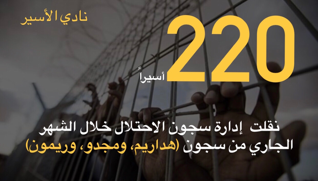 نادي الأسير: إدارة سجون الاحتلال نقلت خلال الشهر الجاري (220) أسيرًا من سجون (هداريم، ومجدو، وريمون)