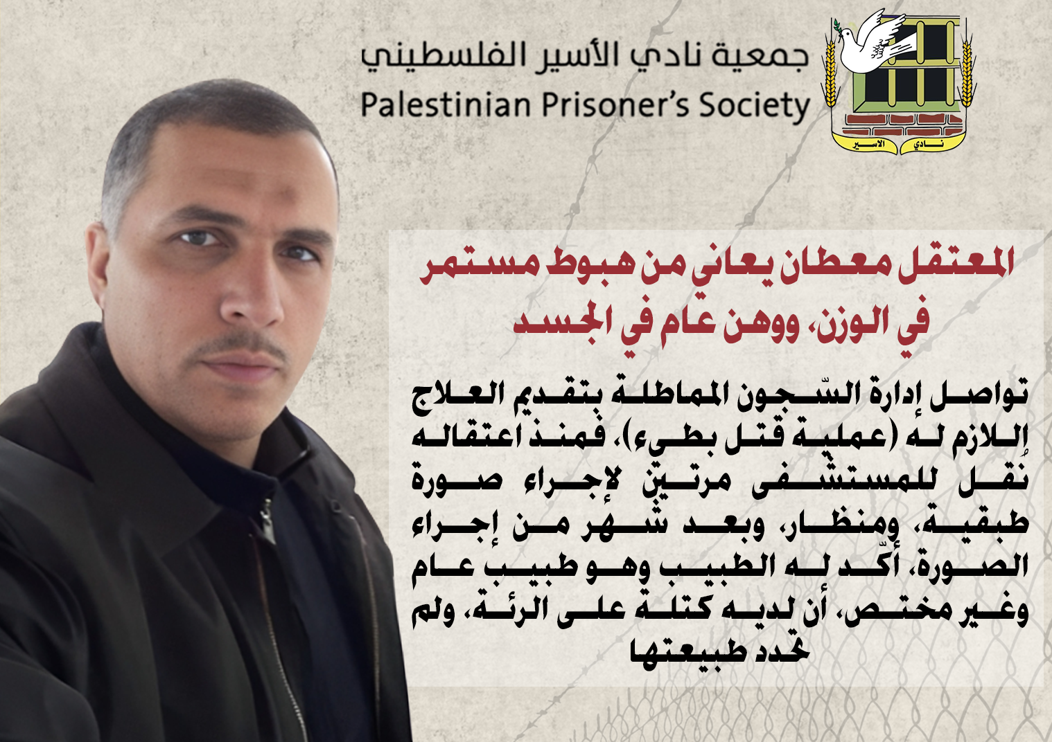 نادي الأسير: المعتقل عبد الباسط معطان المصاب بالسرطان يواجه تدهورًا مستمرًا على وضعه الصحيّ