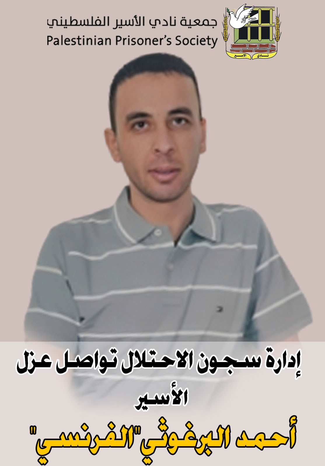 نادي الأسير: إدارة سجون الاحتلال تواصل عزل الأسير أحمد البرغوثي والملقب بالفرنسي، في زنازين سجن "ريمون"، بعد رفضه لقرار نقله من سجن "هداريم" إلى سجن "نفحة".