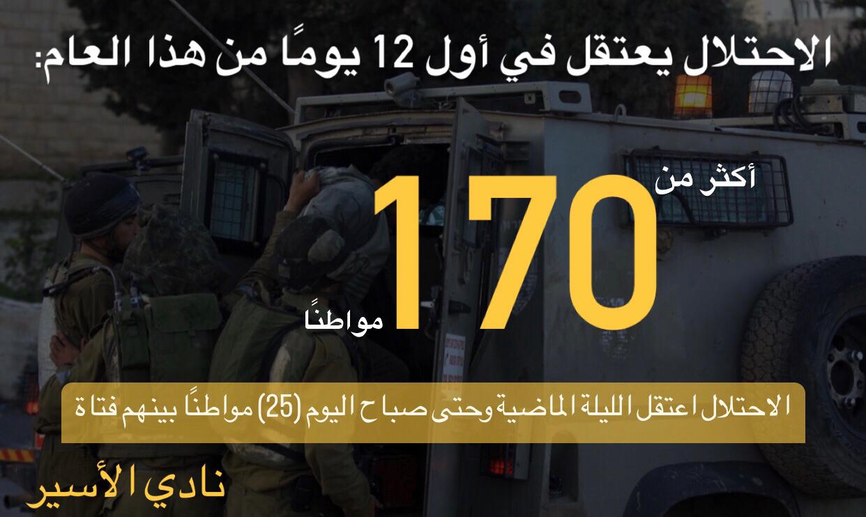 الاحتلال يعتقل في أول 12 يومًا من هذا العام: أكثر من (170) مواطنًا
