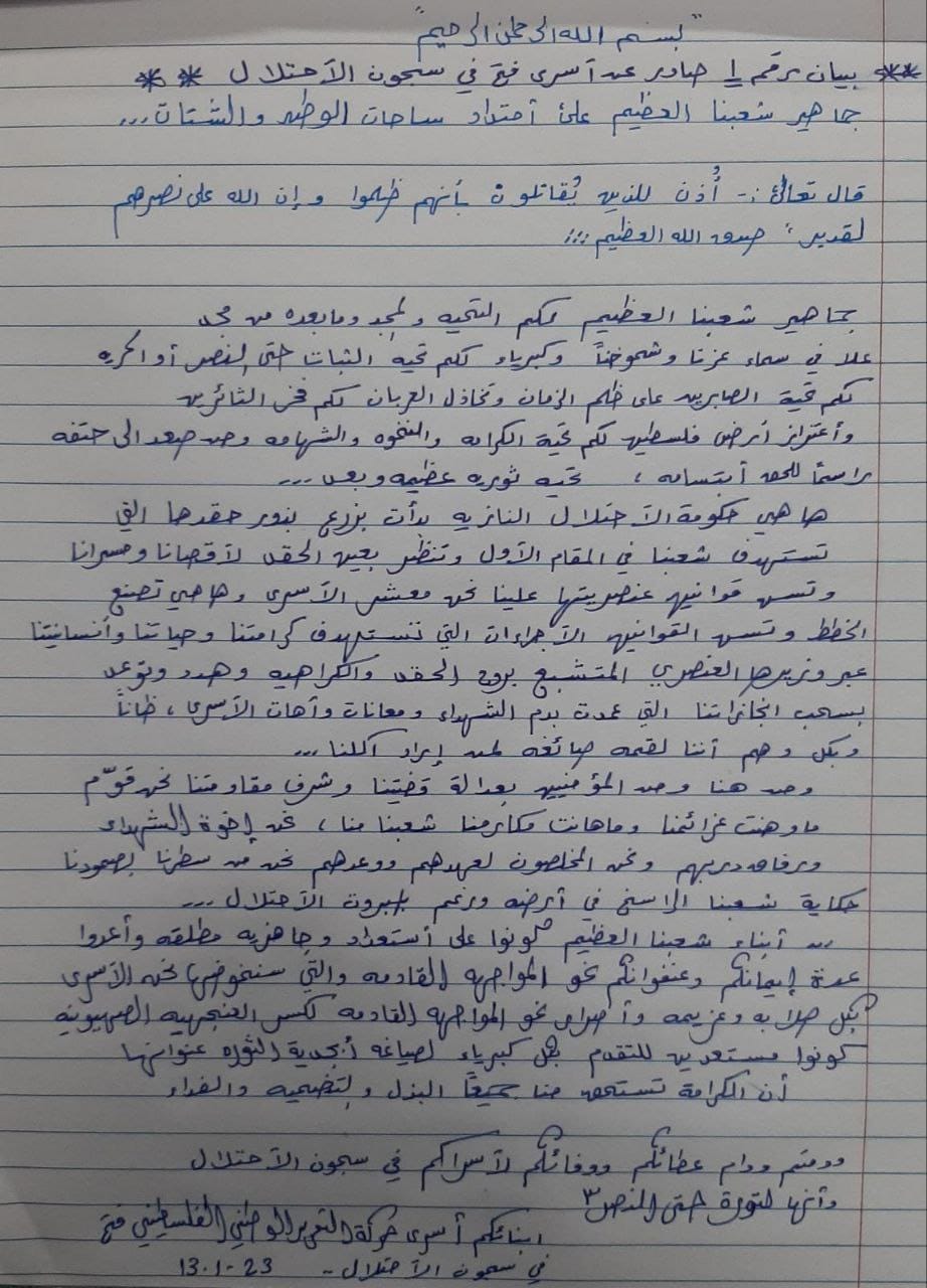 بيان صادر عن أسرى حركة التحرير الوطني "فتح" في سجون الاحتلال