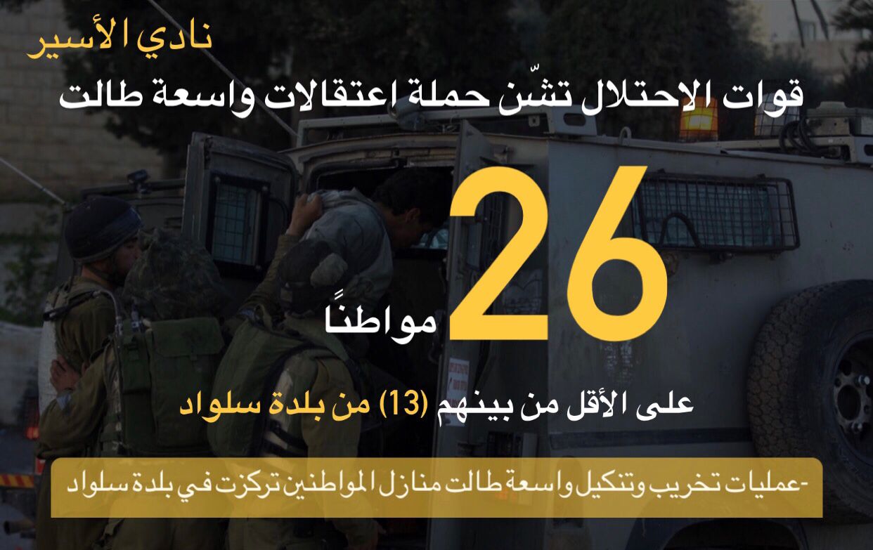 قوات الاحتلال تشّن حملة اعتقالات واسعة طالت (26) مواطنًا على الأقل من بينهم (13) من بلدة سلواد