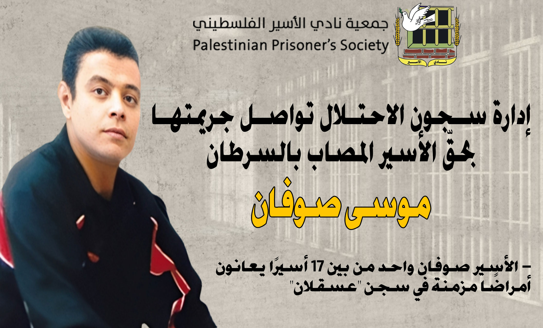 -الأسير صوفان واحد من بين 17 أسيرًا يعانون أمراضًا مزمنة في سجن "عسقلان"