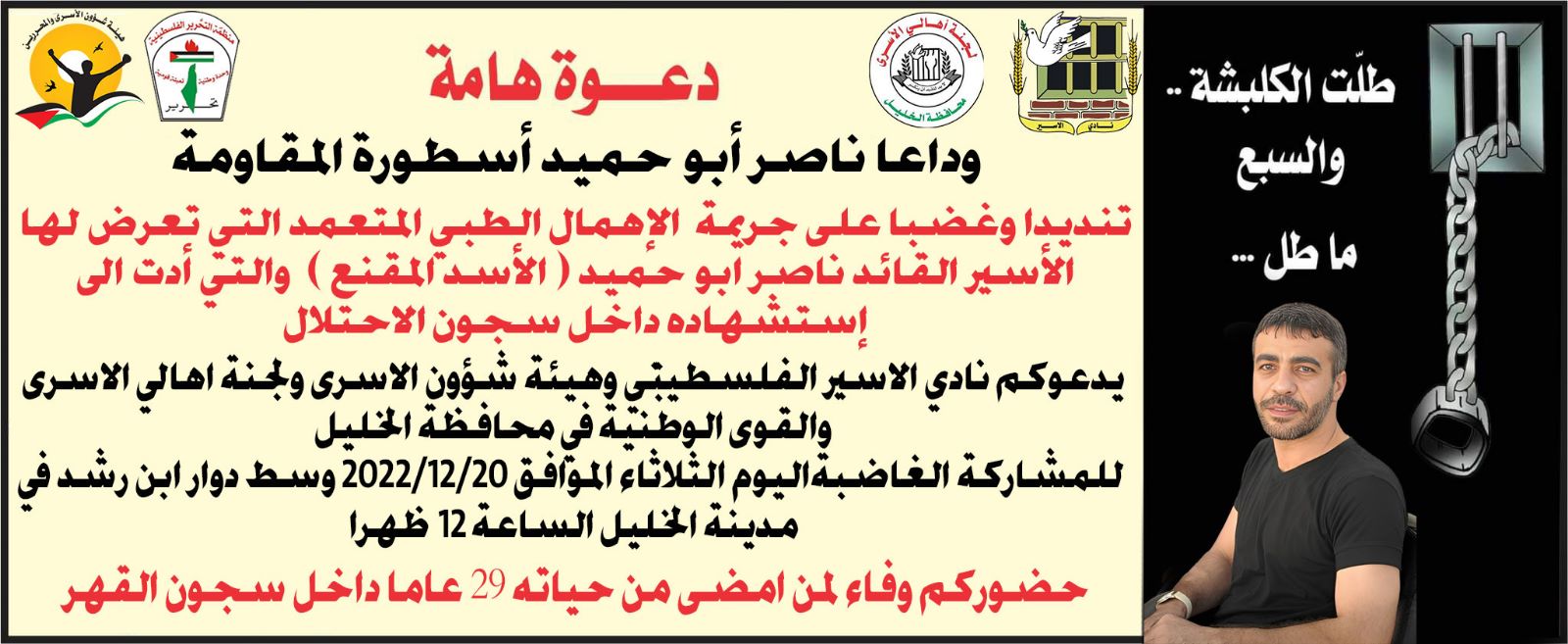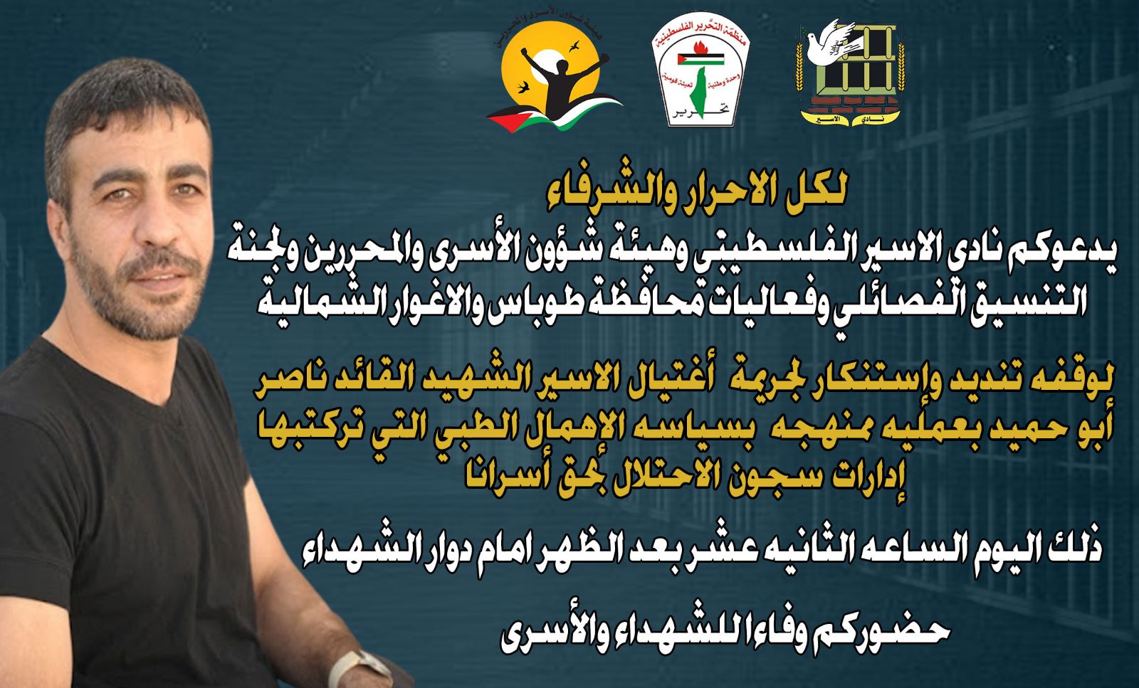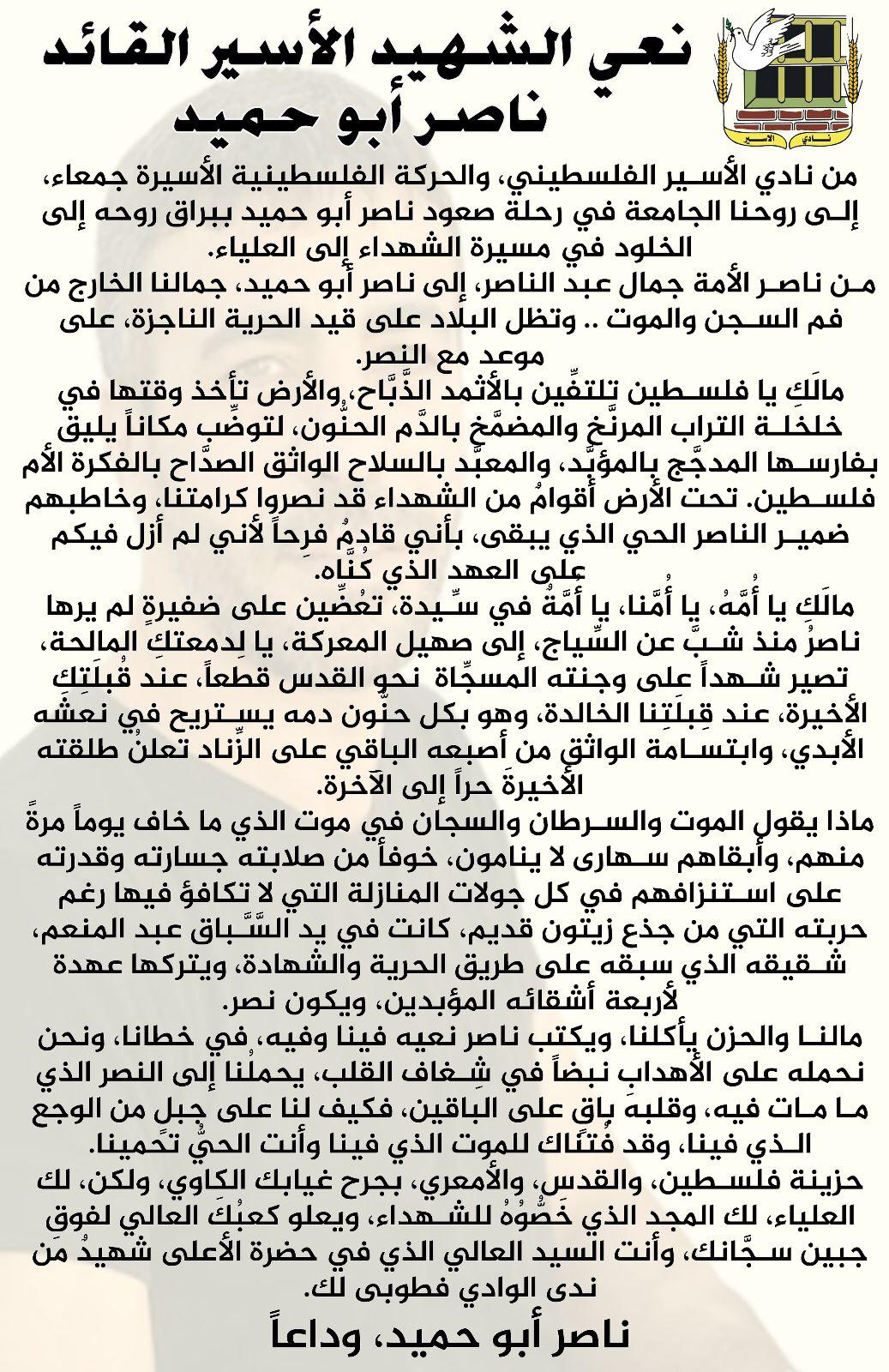 نعي الشهيد القائد ناصر ابو حميد صادر عن نادي الأسير والحركة الأسيرة في سجون الاحتلال