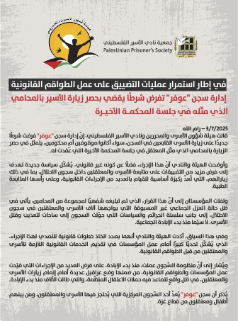🔴 إدارة سجن "عوفر" تفرض شرطًا يقضي بحصر زيارة الأسير بالمحامي الذي مثّله في جلسة المحكمة الأخيرة