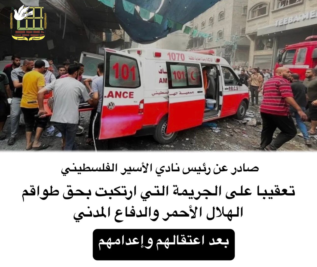 ● تعقيب صادر عن رئيس نادي الأسير الفلسطيني على الجريمة التي ارتكبها جيش الاحتلال في غزة بحق طواقم الهلال الأحمر والدفاع المدني بعد اعتقالهم وإعدامهم