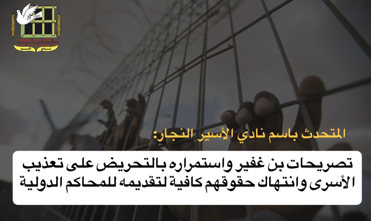 ● المتحدث باسم نادي الأسير النجار: "تصريحات الفاشي "بن غفير" واستمراره بالتحريض على تعذيب الأسرى وانتهاك حقوقهم كافية لتقديمه للمحاكم الدولية"