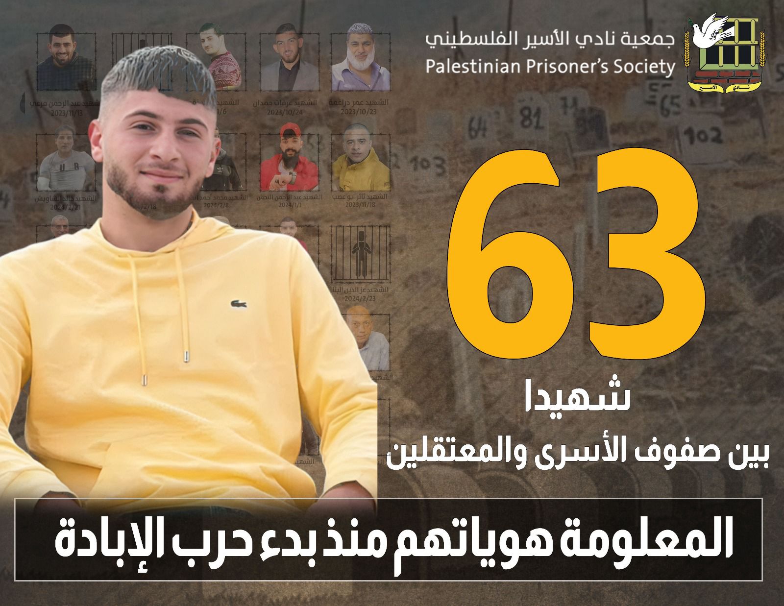 ▪ (63) شهيداً بين صفوف الأسرى والمعتقلين داخل سجون الاحتلال منذ بدء حرب الإبادة