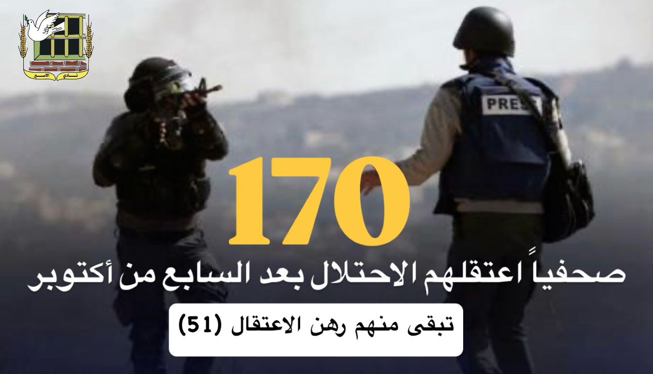 ▪ نادي الأسير: مع اعتقال الصحفي أحمد الخطيب فجر اليوم ترتفع حالات الاعتقال بين صفوف الصحفيين بعد السابع من أكتوبر إلى ما لا يقل عن (170) صحفياً/ة، تبقى منهم رهن الاعتقال (51).