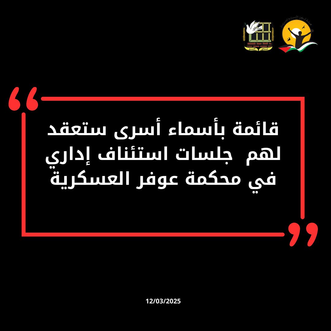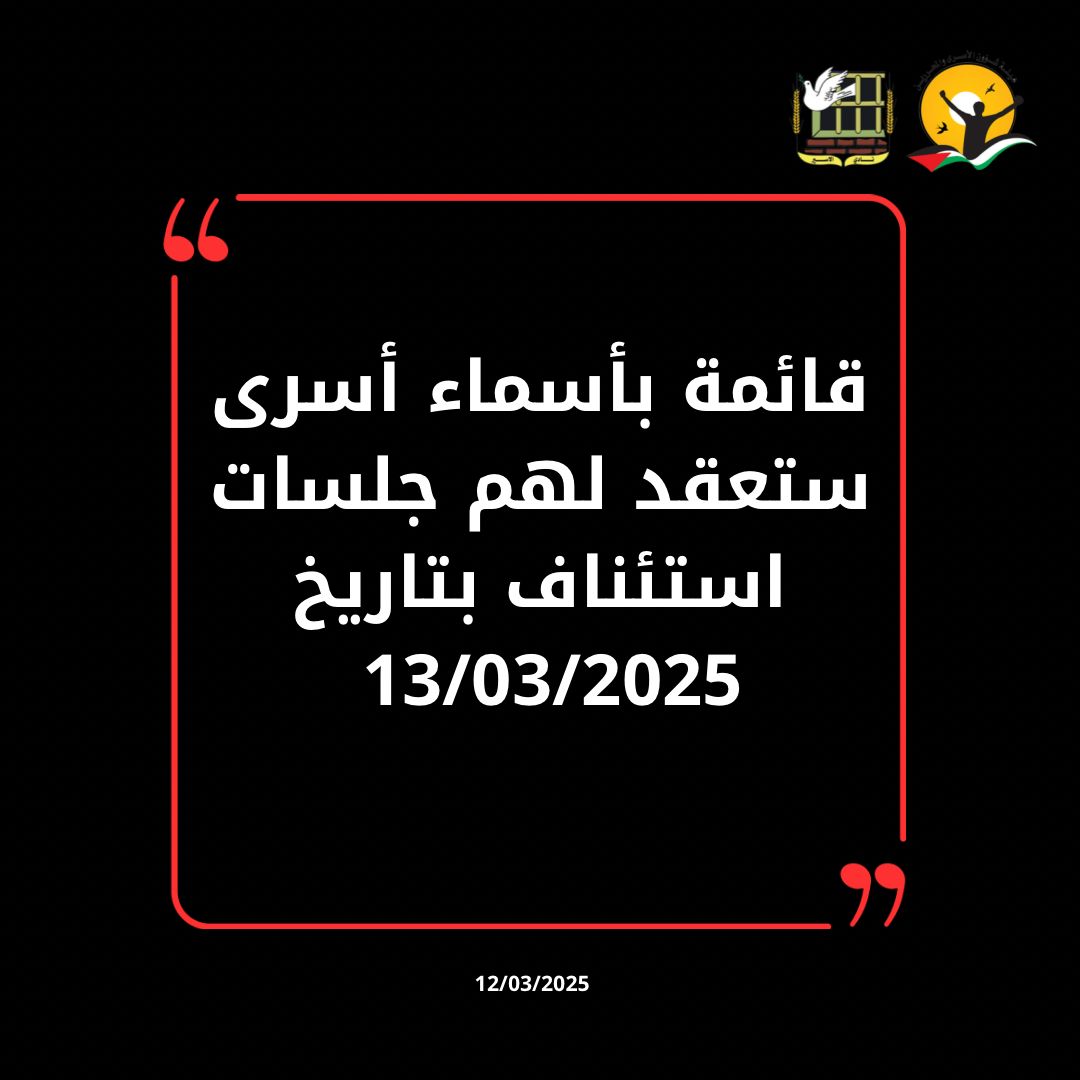 قائمة بأسماء أسرى ستعقد لهم جلسات استئناف بتاريخ 13/03/2025 الساعه التاسعة والنصف صباحاً المزيد من التفاصيل