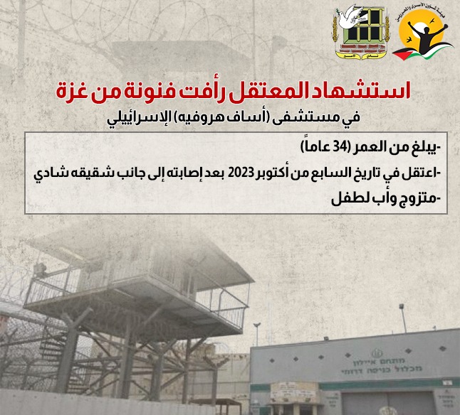 ▪ استشهاد المعتقل رأفت ابو فنونة من غزة يبلغ من العمر 34 عاما، اعتقل في تاريخ السابع من أكتوبر 2023 بعد إصابته، وهو متزوج وأب لطفل، وله شقيق آخر معتقل