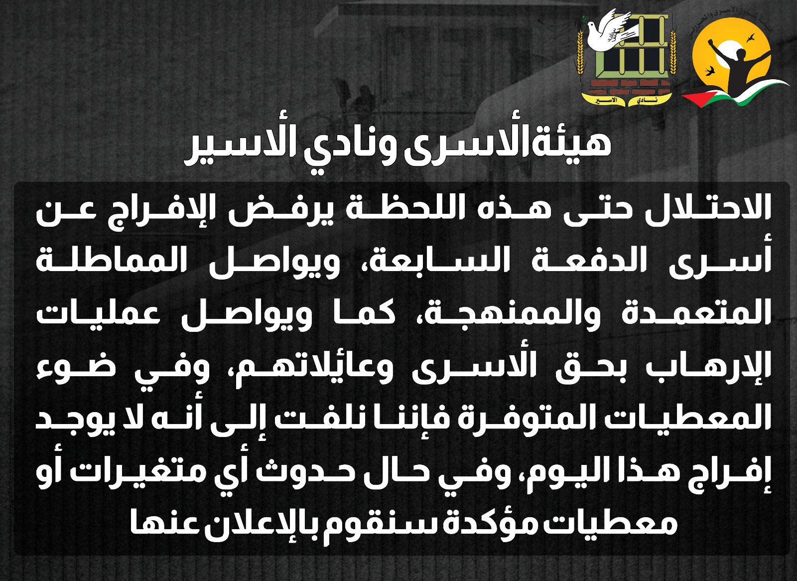 ■ نادي الأسير: إن قرار سلطات الاحتلال التأخير في الإفراج عن الدفعة السابعة، يشكّل جزءا من أشكال الإرهاب المنظم بحق الأسرى وعائلاتهم، خاصّة في ظل أجواء البرد القارس