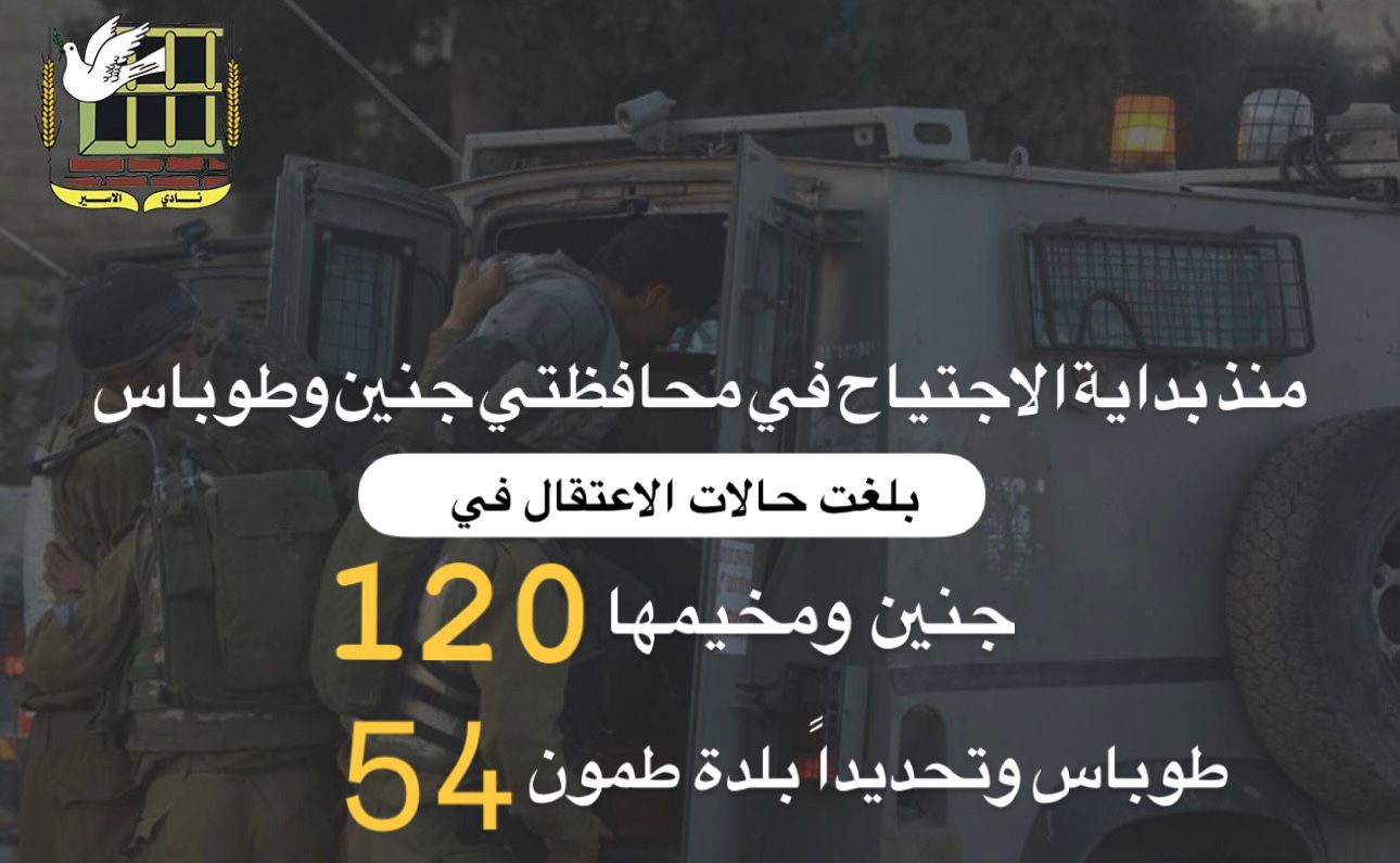 ■ نادي الأسير: تواصل سلطات الاحتلال الإسرائيليّ، تصعيدها من عمليات الاعتقال والتّحقيق الميداني تحديداً في محافظتي جنين ومخيمها المزيد من التفاصيل