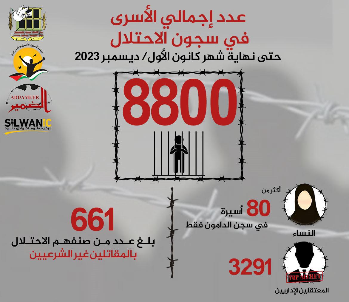 رام الله - أصدرت مؤسسات الأسرى (هيئة شؤون الأسرى والمحررين، ونادي الأسير الفلسطيني، ومؤسسة الضمير لرعاية الأسير وحقوق الإنسان، ومركز وادي حلوة – القدس) تقريرًا خاصّا يجمل أبرز القضايا والمعطيات الخاصّة بواقع قضية الأسرى والمعتقلين في سجون الاحتلال الإسرائيليّ للعام 2023، إضافة إلى قراءة موسعة حول المعطيات والسياسات والجرائم المروعة التي نفّذها الاحتلال الإسرائيليّ خلال حملات الاعتقال في الضّفة بشكل أساس، وتصاعد هذه الحملات والجرائم بعد تاريخ السابع من أكتوبر، وذلك في ضوء العدوان الشامل الذي يشنّه الاحتلال الإسرائيلي على شعبنا، والإبادة الجماعية المتواصلة في غزة.