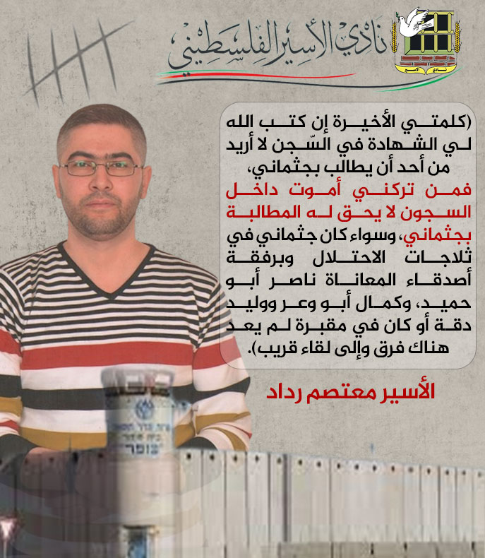 وقد نقل أحد الأسرى المفرج عنهم مؤخرًا رسالة من الأسير رداد قال فيها: (أشعر بداخلي أنني الشهيد القادم داخل سجون الاحتلال، فوضعي يتدهور يوميًا وخلال الأشهر الماضية أصبتُ بحالات إغماء متواصلة، والأمعاء تنزف دمًا يوميًا، ودقات القلب غير منتظمة مع ارتفاع دائم في ضغط الدم، إلى جانب معاناتي من ضيق التنفس، وأكاد أختنق بلا مغيث، عدا عن الآلام الشديدة التي أعاني منها في الظهر والمفاصل، كما وأعاني من صعوبة كبيرة في النوم، والكلمة الوحيدة التي أتلقاها من السجانين، "أنك ميت ميت هنا"، فمعاناتنا كمرضى في السجون لا يمكن تصورها بأي شكل من الأشكال نحن نموت يوميًا فنحن محتجزون في زنازين ومحاصرون بالجوع والعطش والقمع والتنكيل والتعذيب ومحرومون من أدنى شروط الرعاية الصحيّة).