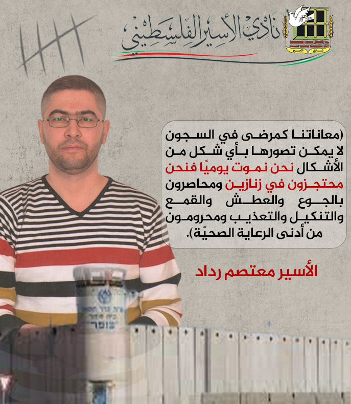 وأوضح نادي الأسير، أنّ الأسير رداد والمحكوم بالسجن لمدة (20 عاماً)، والمحتجز في قسم (22) في سجن (عوفر) داخل زنزانة لا تتوفر فيها أدنى شروط الحياة الآدمية، والظروف الصحيّة المناسبة لوضعه الصحيّ، حيث تعتبر حالة الأسير رداد من أصعب الحالات المرضية في سجون الاحتلال الإسرائيليّ، حيث أقدمت إدارة السجون على نقله منذ بداية العدوان من (عيادة سجن الرملة) إلى سجن (عوفر)، إلى جانب أسرى مرضى آخرين تم قمعهم ونقلهم كذلك.
