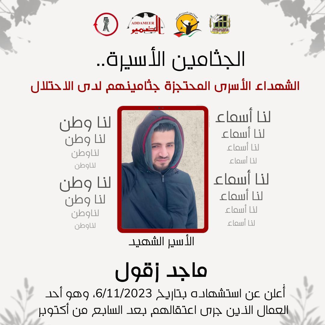 14. الأسير الشهيد ماجد زقول أُعلن عن استشهاده في تاريخ 6/11/2023، وهو أحد العمال الذين جرى اعتقالهم بعد السابع من أكتوبر.