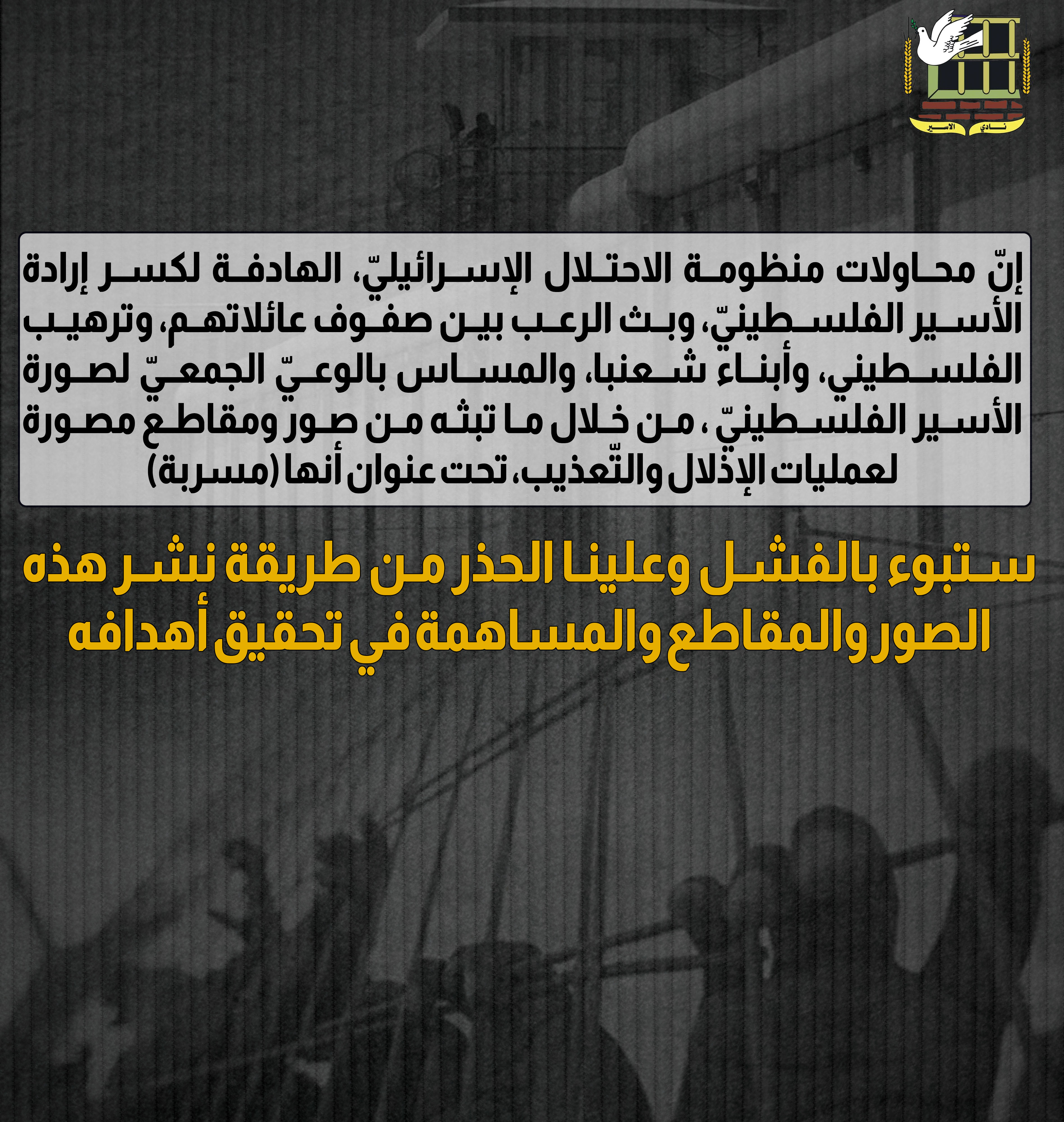 رام الله - قال نادي الأسير الفلسطينيّ، إن محاولات منظومة الاحتلال الإسرائيليّ، الهادفة لكسر إرادة الأسير الفلسطينيّ، وبث الرعب بين صفوف عائلاتهم، وترهيب الفلسطينيّ، وأبناء شعنبا، والمساس بالوعيّ الجمعيّ لصورة الأسير الفلسطينيّ ، من خلال ما تبثه من صور ومقاطع مصورة لعمليات الإذلال والتّعذيب، تحت عنوان أنها (مسربة)، ستبوء بالفشل، وعلينا الحذر من طريقة نشر هذه الصور والمقاطع، والمساهمة في تحقيق أهدافه.