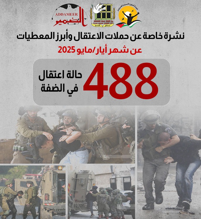 وأضافت المؤسسات في نشرة عن أبرز المعطيات والقضايا التي وثقتها -خلال شهر- أيار/ مايو 2025، إنّ حملات الاعتقال هذه تتواصل مع استمرار حرب الإبادة الجماعية بحقّ شعبنا في غزة، وتصاعد العدوان الشامل على كافة الجغرافيات الفلسطينية، بما فيه تصاعد -غير المسبوق- لعدوان المستوطنين، الذي ساهم في تصاعد حملات الاعتقال في العديد من القرى والبلدات، وذلك في ظل تصاعد المواجهة، ومحاولة المواطنين المستمرة لتصدي للعدوان المتصاعد بحقّهم، وقد رافق حملات الاعتقال المكثفة، عمليات إعدام ميدانية، وتدمير لعشرات المنازل -تحديدا- في محافظتي جنين، وطولكرم التي تشهدان عدوان هو الأكبر والأخطر منذ انتفاضة الأقصى. وإلى جانب هذا استمر الاحتلال في التصعيد من عمليات التحقيق الميداني التي يرافقها عمليات تنكيل واعتداءات بالضرب المبرح، وعمليات إرهاب منظمة، لا سيما بحقّ عائلات المطاردين. ونشير هنا مجدداً إلى استخدام قوات الاحتلال أفراداً من عائلات المطاردين، رهائن، -وتحديداً- بين صفوف النساء، كما لم يستثن الاحتلال الأطفال.