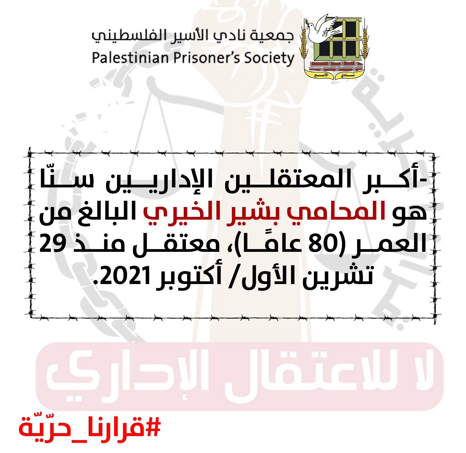 -أكبر المعتقلين الإداريين سنّا هو المحامي بشير الخيري البالغ من العمر (80 عامًا)، معتقل منذ 29 تشرين الأول/ أكتوبر 2021.