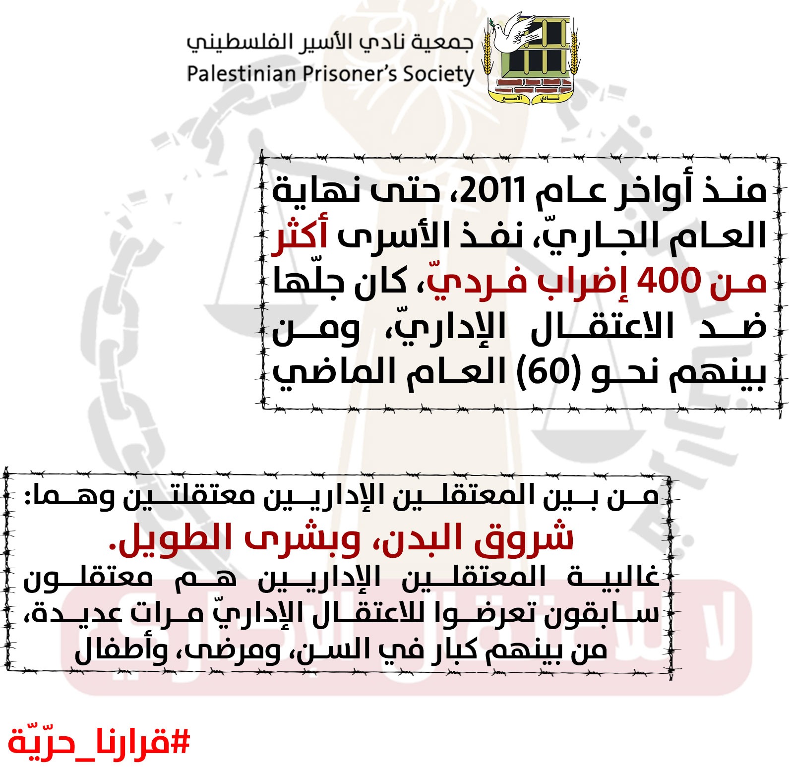 -منذ أواخر عام 2011، حتى نهاية العام الجاريّ، نفذ الأسرى أكثر من 400 إضراب فرديّ، كان جلّها ضد الاعتقال الإداريّ، ومن بينهم نحو (60) العام الماضي 2021.