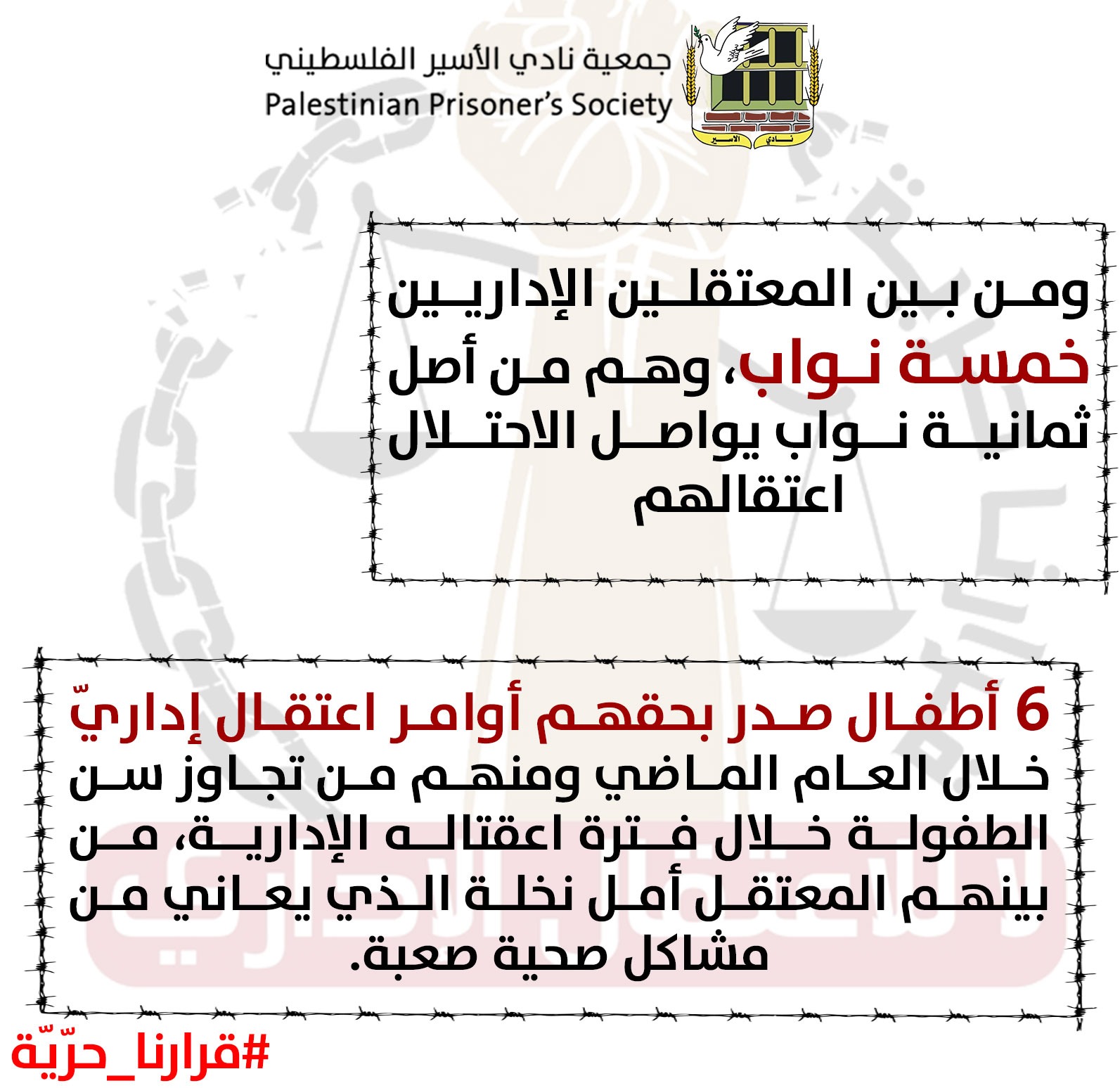 -ومن بين المعتقلين الإداريين خمسة نواب، وهم من أصل ثمانية نواب يواصل الاحتلال اعتقالهم.