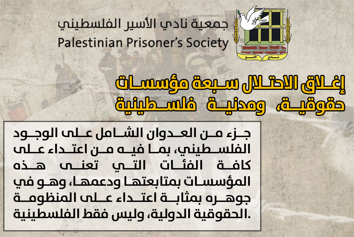 👈رام الله – نادي الأسير: قال نادي الأسير الفلسطيني، إنّ إغلاق الاحتلال سبعة مؤسسات حقوقية، ومدنية فلسطينية فجر اليوم في رام الله وهي: (مؤسسة الحق، ومؤسسة الضمير لرعاية الأسير وحقوق الإنسان، ومركز بيسان للبحوث والإنماء، والحركة العالمية للدفاع عن الأطفال، ولجان العمل الزراعي، ومؤسسة لجان العمل الصحي، واتحاد لجان المرأة)، وإصراره على ملاحقتها، والتضييق عليها وعلى العاملين فيها، جزء من العدوان الشامل على الوجود الفلسطيني، بما فيه من اعتداء على كافة الفئات التي تعنى هذه المؤسسات بمتابعتها ودعمها، وهو في جوهره بمثابة اعتداء على المنظومة الحقوقية الدولية، وليس فقط الفلسطينية.