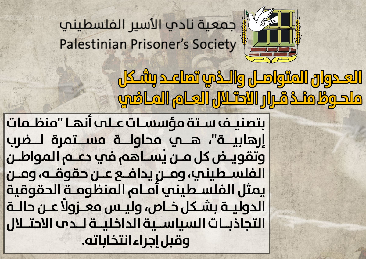 👈وأكّد نادي الأسير إنّ هذا العدوان المتواصل والذي تصاعد بشكل ملحوظ منذ قرار الاحتلال العام الماضي بتصنيف ستة مؤسسات على أنها "منظمات إرهابية" وهي من بين من جرى إغلاقها اليوم، واعتقال بعض العاملين فيها، هي محاولة مستمرة لضرب وتقويض كل من يُساهم في دعم المواطن الفلسطيني، ومن يدافع عن حقوقه، ومن يمثل الفلسطيني أمام المنظومة الحقوقية الدولية بشكل خاص، وليس معزولًا عن حالة التجاذبات السياسية الداخلية لدى الاحتلال وقبل إجراء انتخاباته.